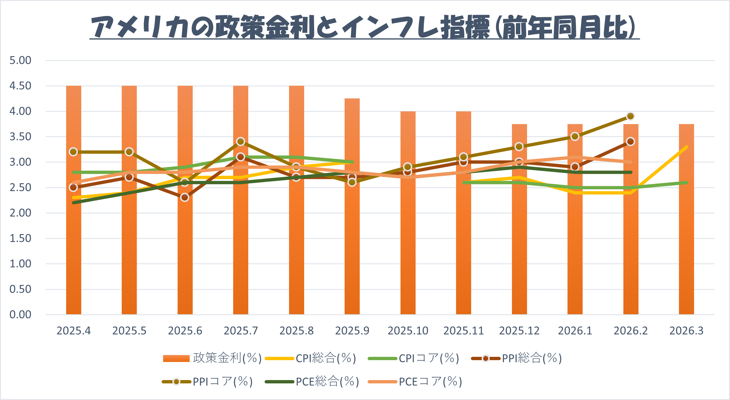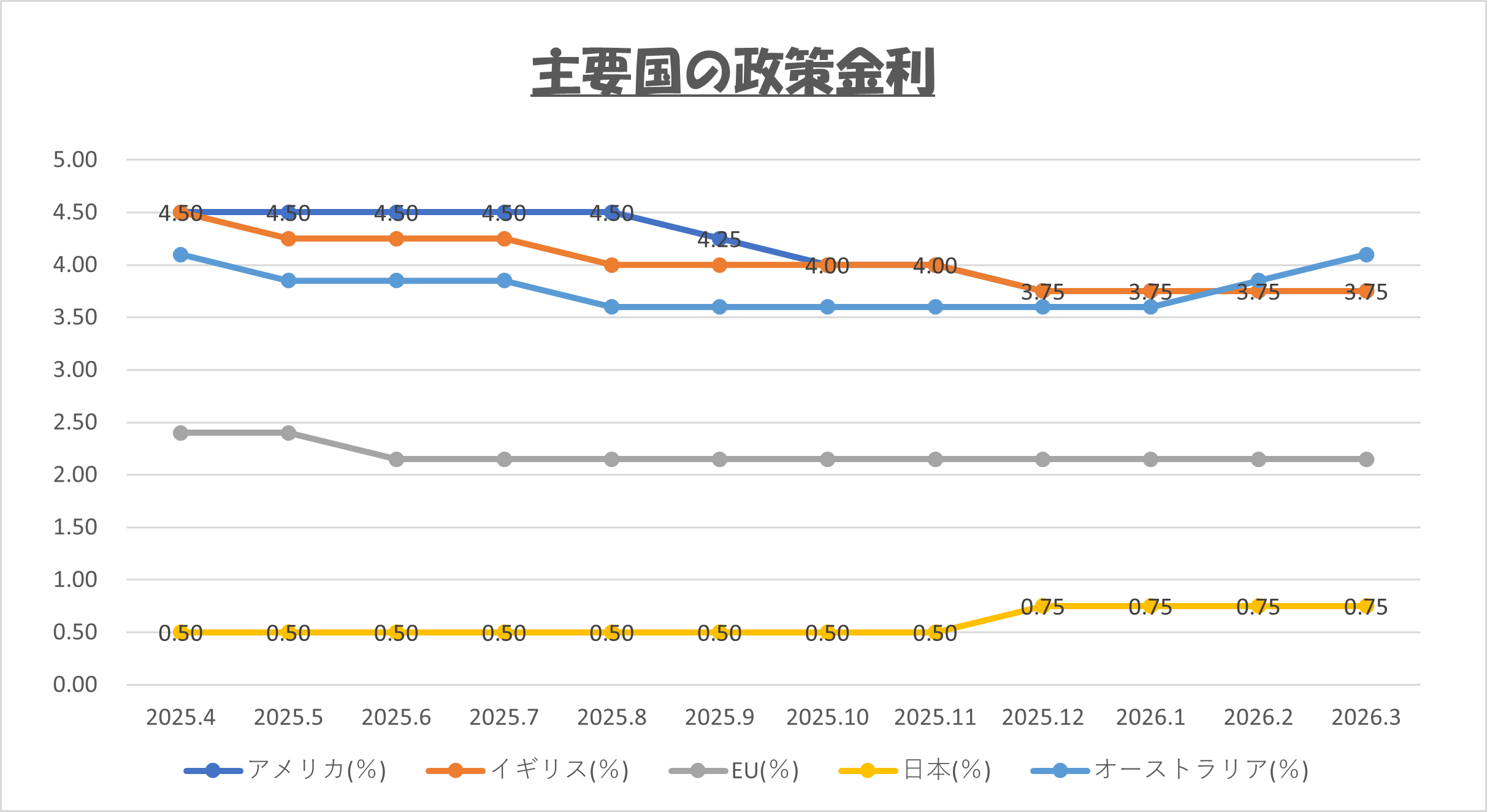 日本が利上げ方向に舵を切っているのに対して、その他の主要国はインフレ鈍化や景気悪化懸念により利下げ方向になっていて、政策金利の方向性が顕著になってきましたが、イラン戦争による原油価格高騰から、直筋ではインフレ再燃懸念となっています。