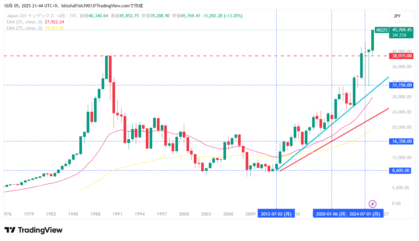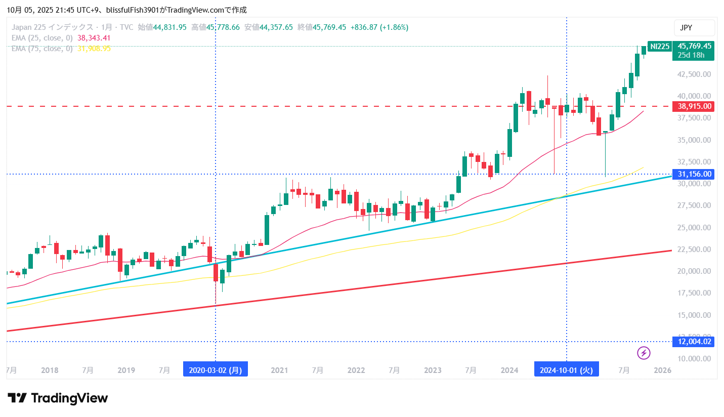 次に東日本大震災後の安値と2023年1月の株価反発ポイントを結んだ水色のトレンドラインが調整下落の目安になると思います。月足の75EMA(黄色の波線)あたりに引かれた直線で、意識されている水準のように見受けられます。2025年は30,000円前後になるのが確認できると思います。最高値からは約29%下落した水準になります。(75EMAとは直近の価格の比重を高めた75ヶ月移動平均のことですが、難しく考えなくてOKです)