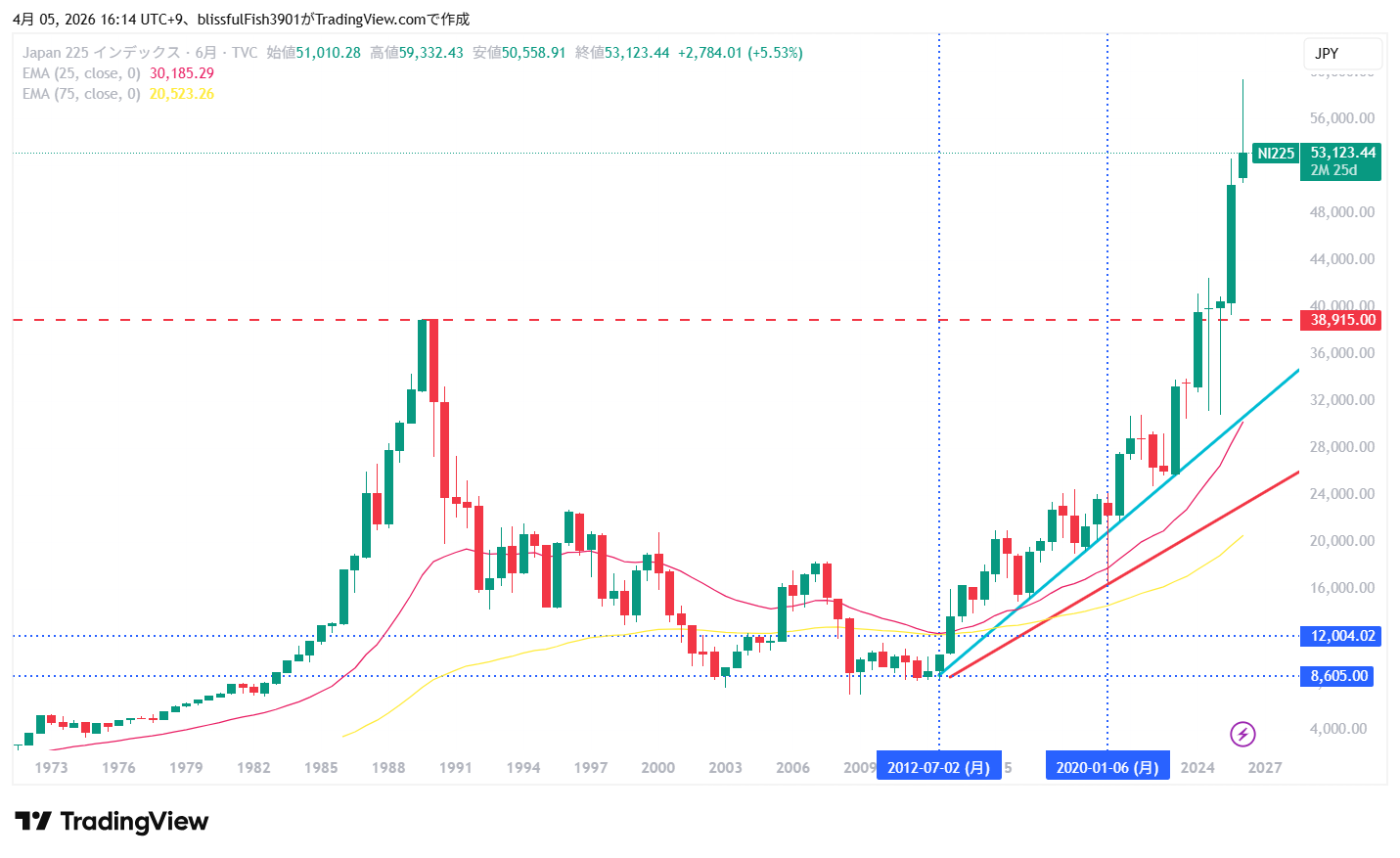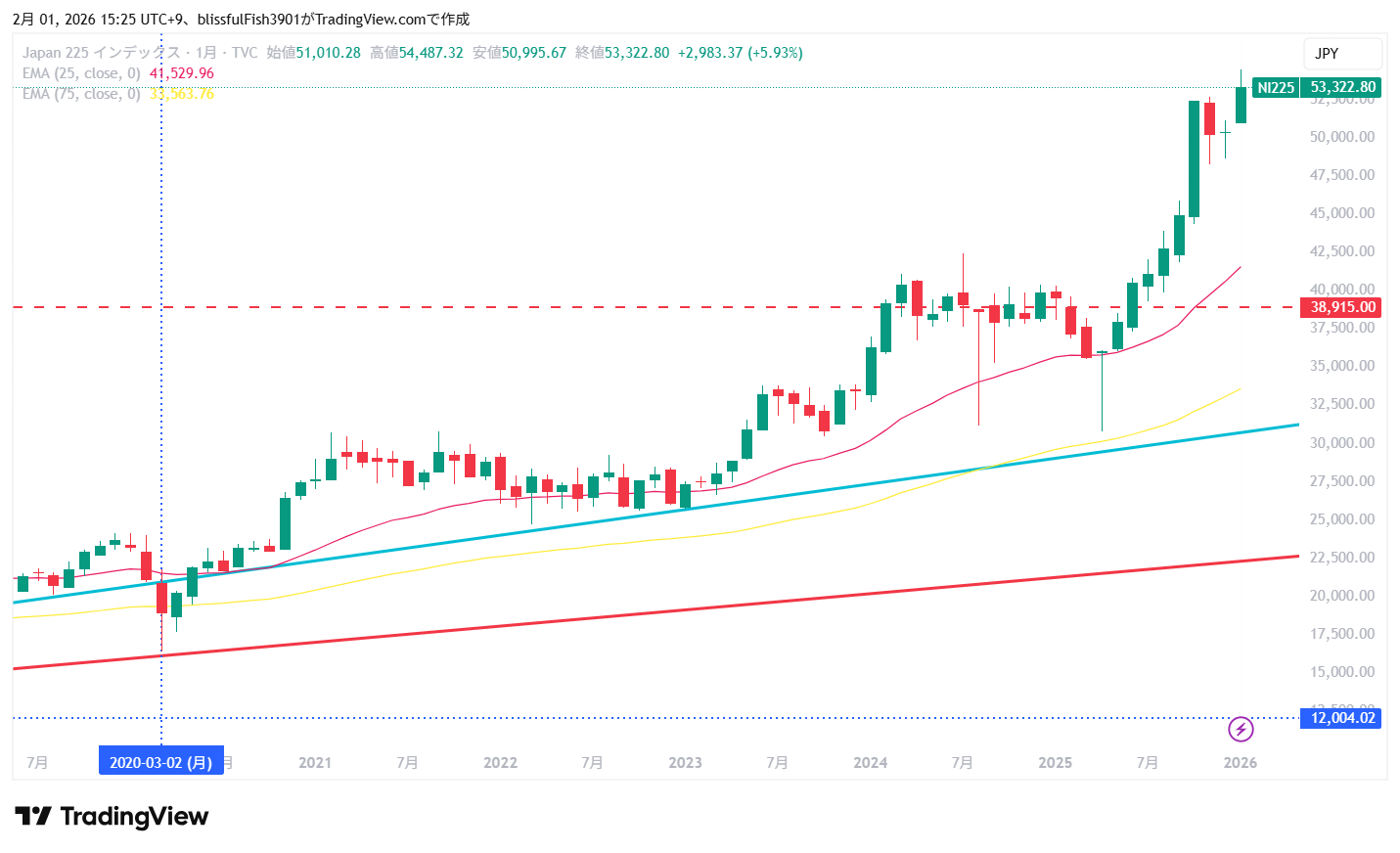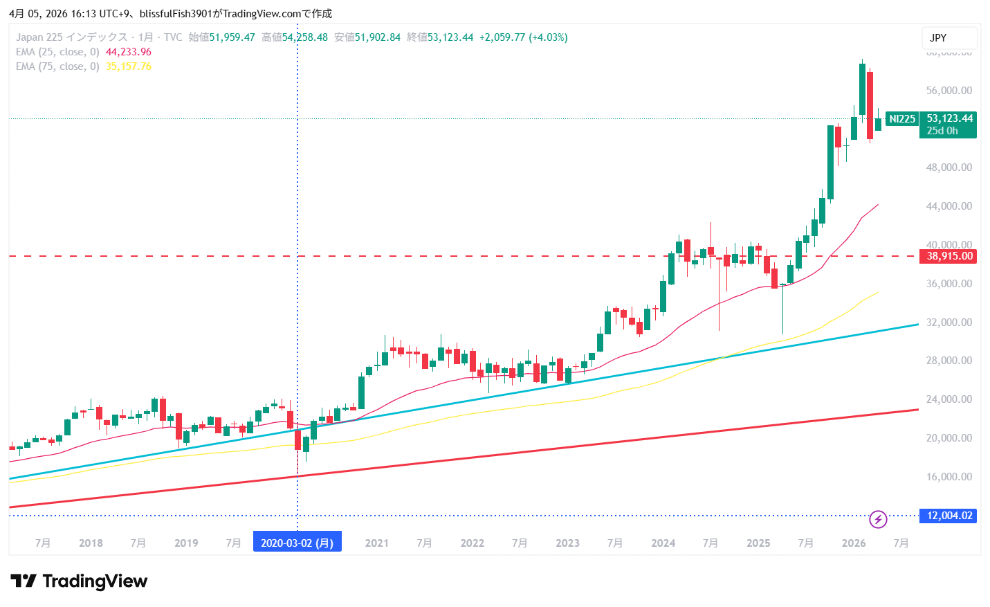 次に東日本大震災後の安値と2023年1月の株価反発ポイントを結んだ水色のトレンドラインが調整下落の目安になると思います。2025年は31,600円前後になるのが確認できると思います。最高値からは約40%下落した水準になります。コロナショック後の米国株と同様に日本株も一気に5万円突破まで上昇してきましたので、それなりの下落リスクを想定しておく必要があります。