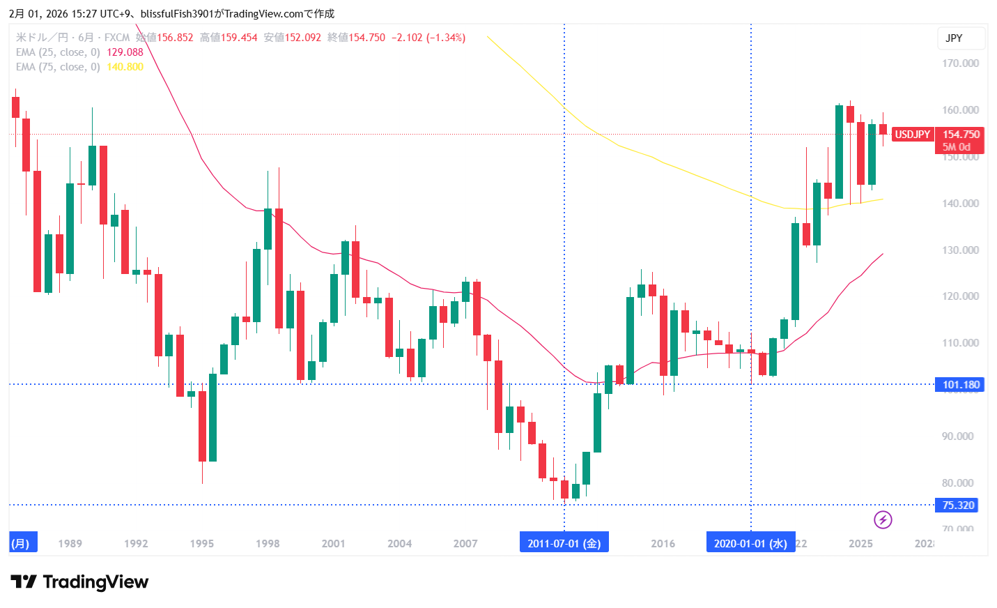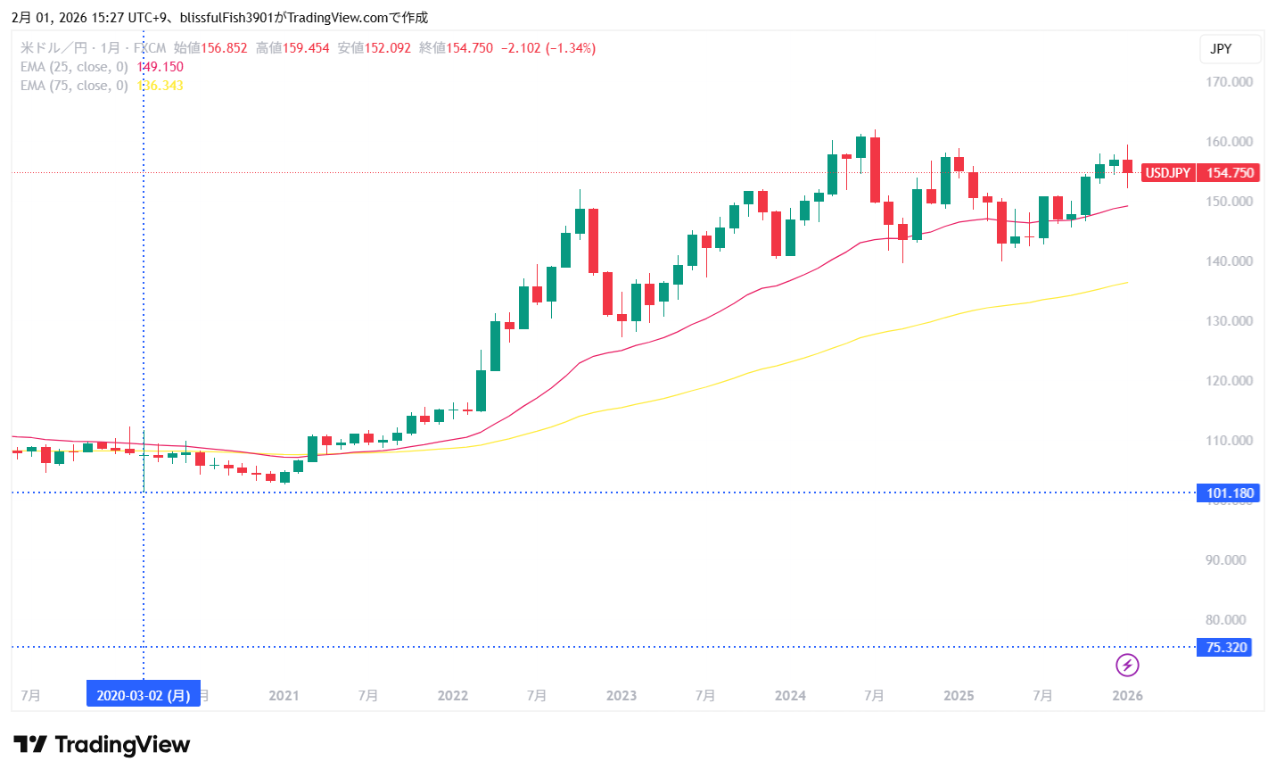 2026年2月1日現在、日米金利差は縮小傾向になるも、円安は収まりそうもない状況です。日米ともに4月までは政策金利は据え置きが予想されていて、BOJ後の植田日銀総裁会見が終わると円安が止まらなくなり、日米協調でレートチェックを入れて1米ドル152円台まで牽制した形になりました。直近は154円台まで再び戻って週末を迎えています。