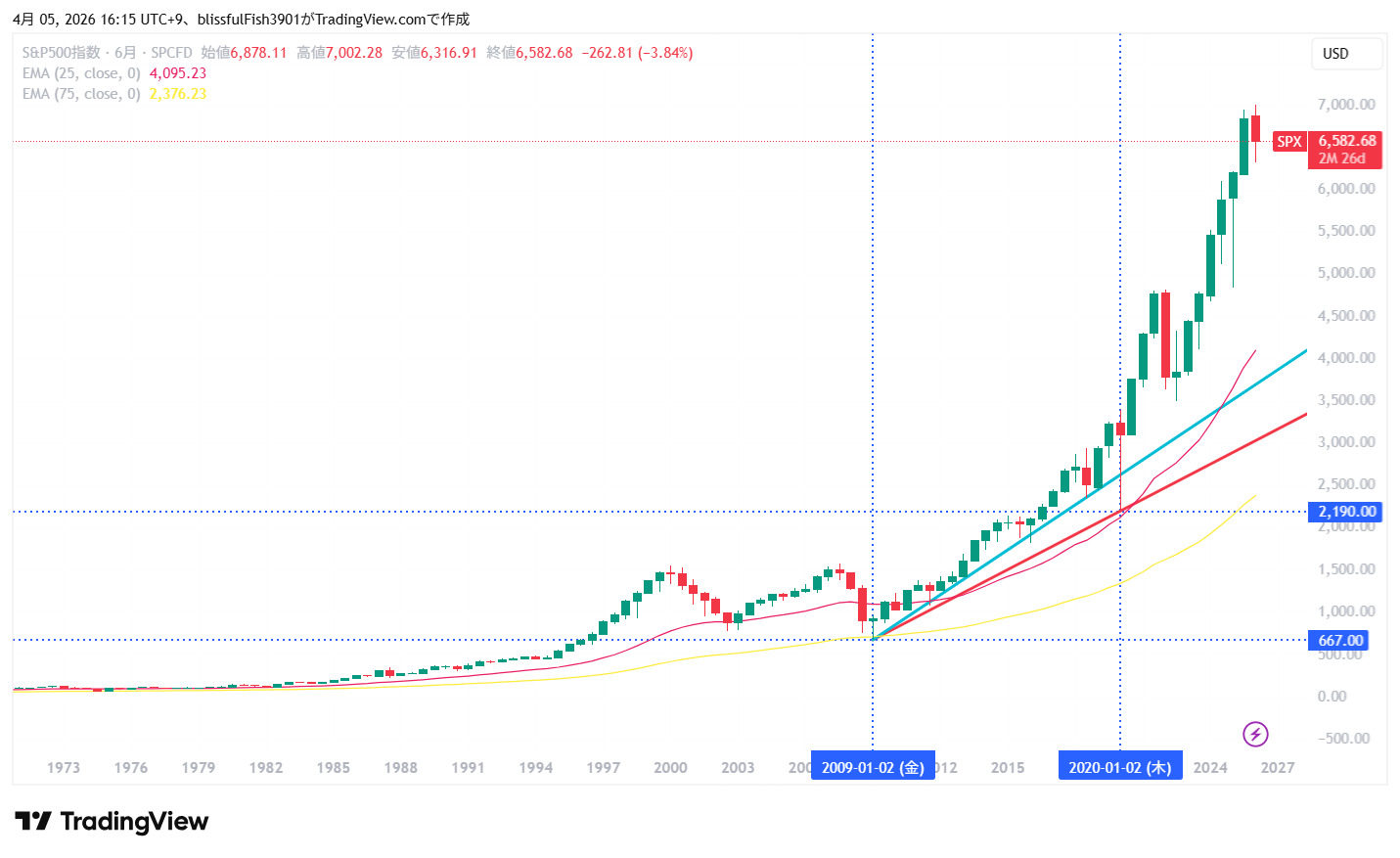 リーマンショック後の安値とコロナショック後の安値を結んだピンクのトレンドラインが大暴落時の下落目安となります。2026年は3,150pt前後になるのが確認できると思います。2025年末時点で市場最高値が6,950ptくらいなので約55%の下落となります。SP500の最大ドローダウンも日経平均と同様に50%超くらいを想定しておく必要があります。