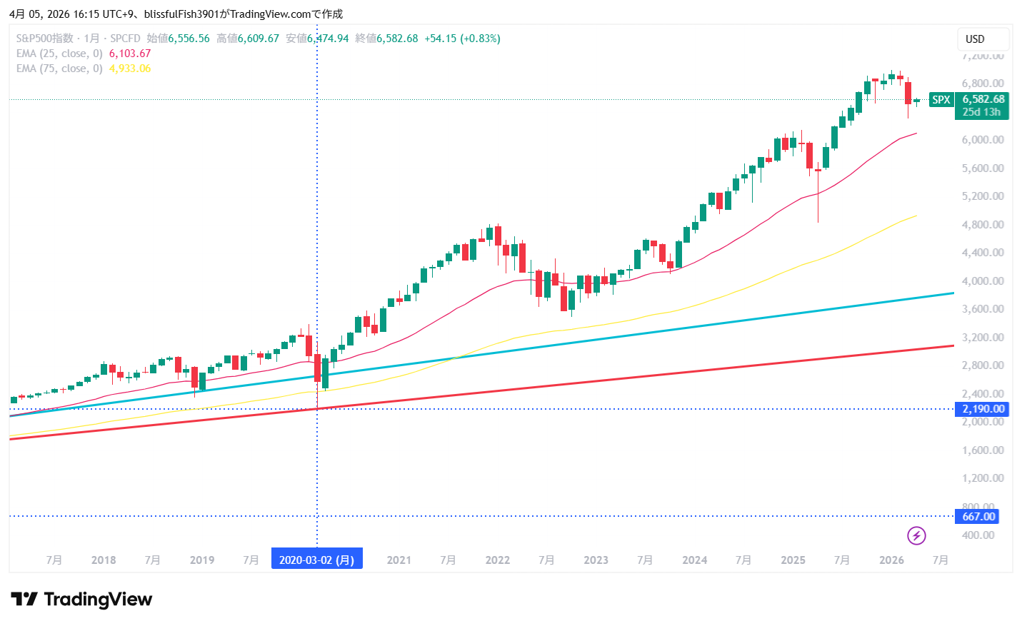 次にリーマンショック後の安値とコロナショック後の安値をヒゲを含まない実体で結んだ水色のトレンドラインが調整下落の目安になると思います。2026年は3,800ptあたりになるので、調整下落としても45%くらいの下落を想定しておく必要がありそうです。