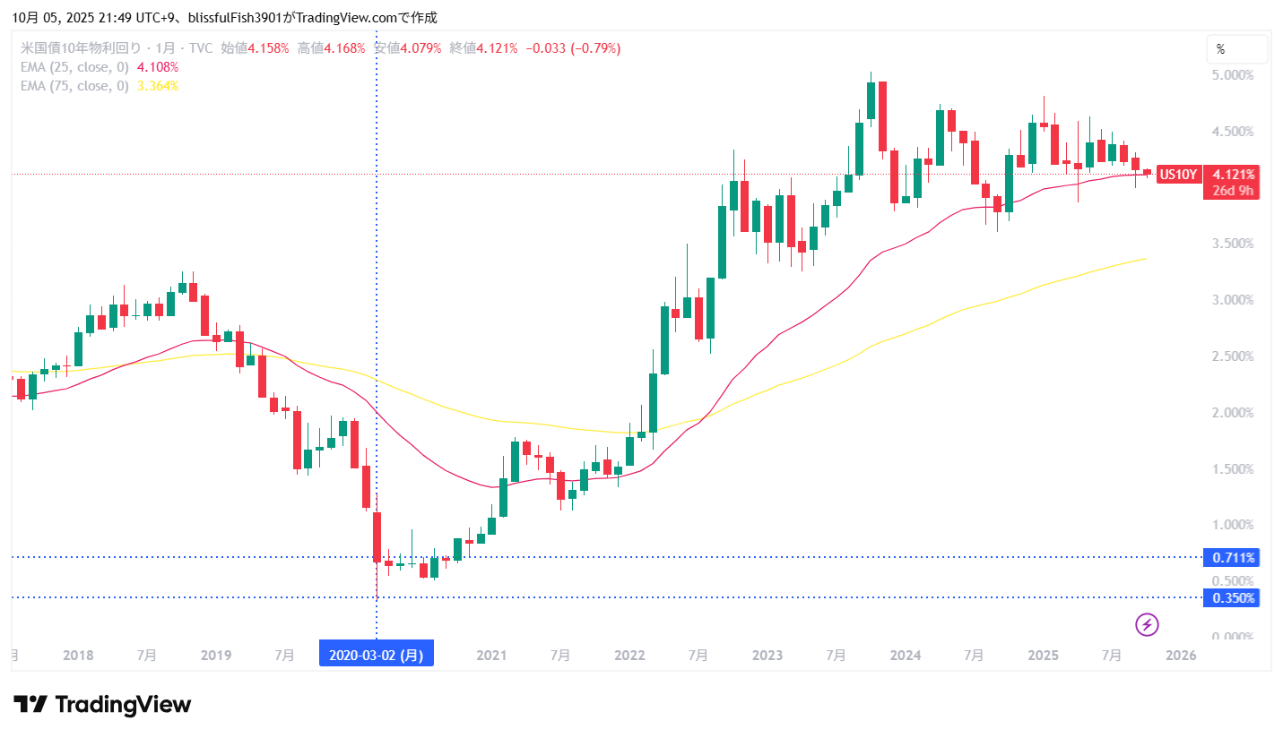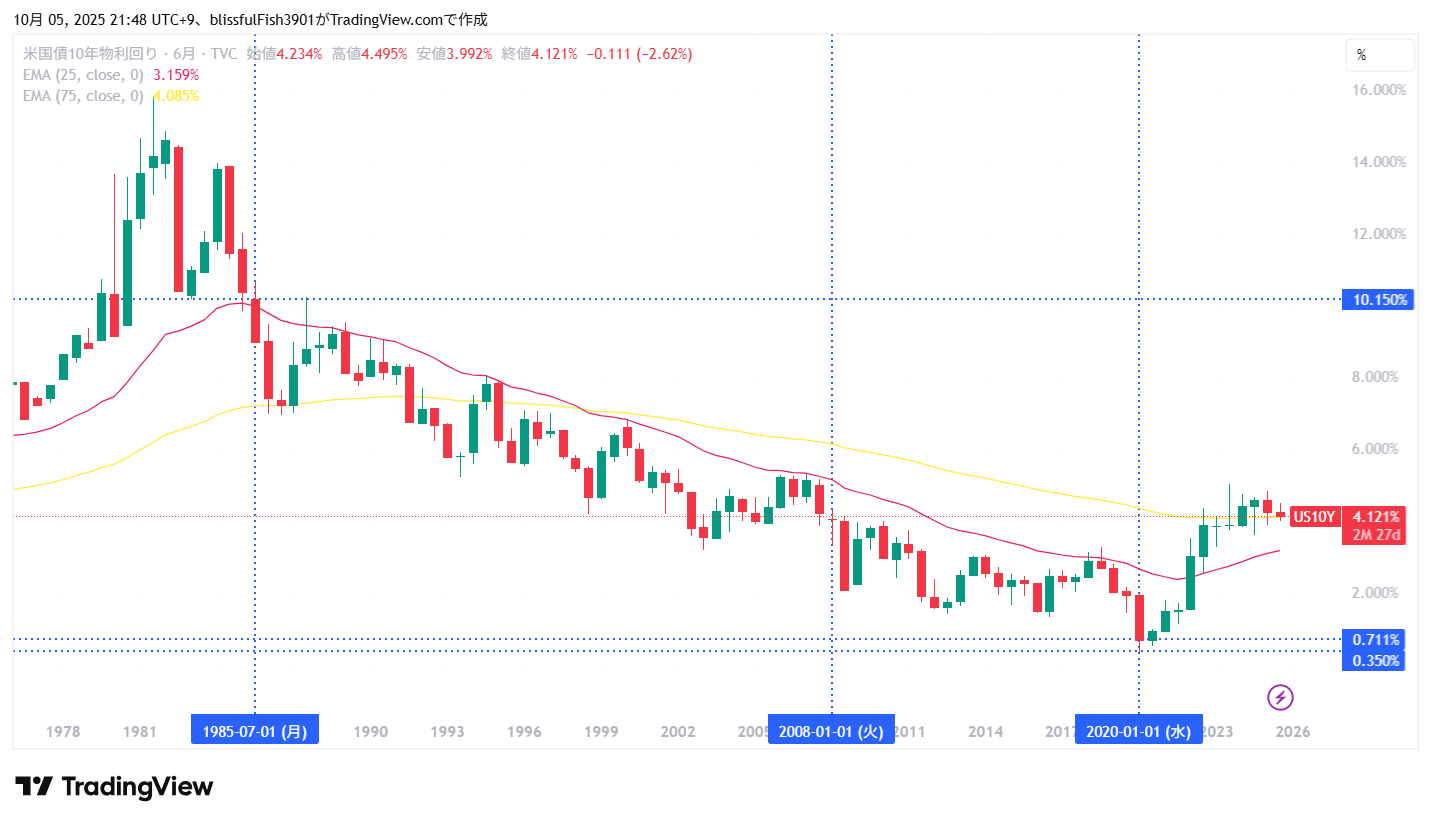 トランプ関税発動で金利は予想しにくい状況が続きます。FRBは利下げを再開し、日銀は年内利下げが予想されています。ドルも円も大きく売られて主要国のバランスシートは棄損し、金利上昇して法定通貨の価値低下が懸念されています。しばらくは長期金利は要注意です。