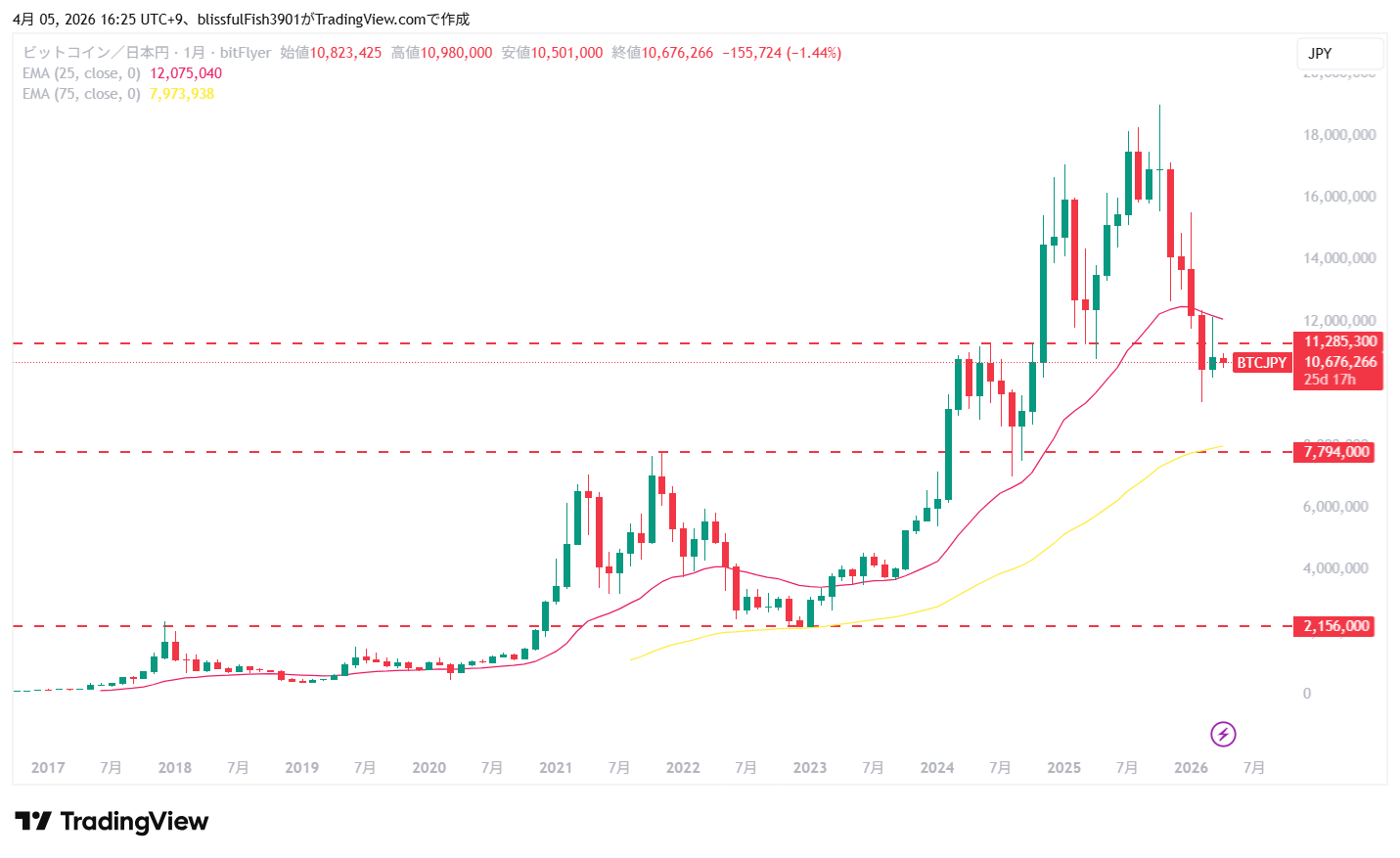 為替水準を排除するため、まずはドル建てビットコインの長期チャートを用いて見ていきます。VIXとは対照的にリスクオンの水準確認用としてビットコインチャートを使用します。ビットコインはリスク選好資産と考えられ、株式が売られる時の先行指標と考える事もできます。